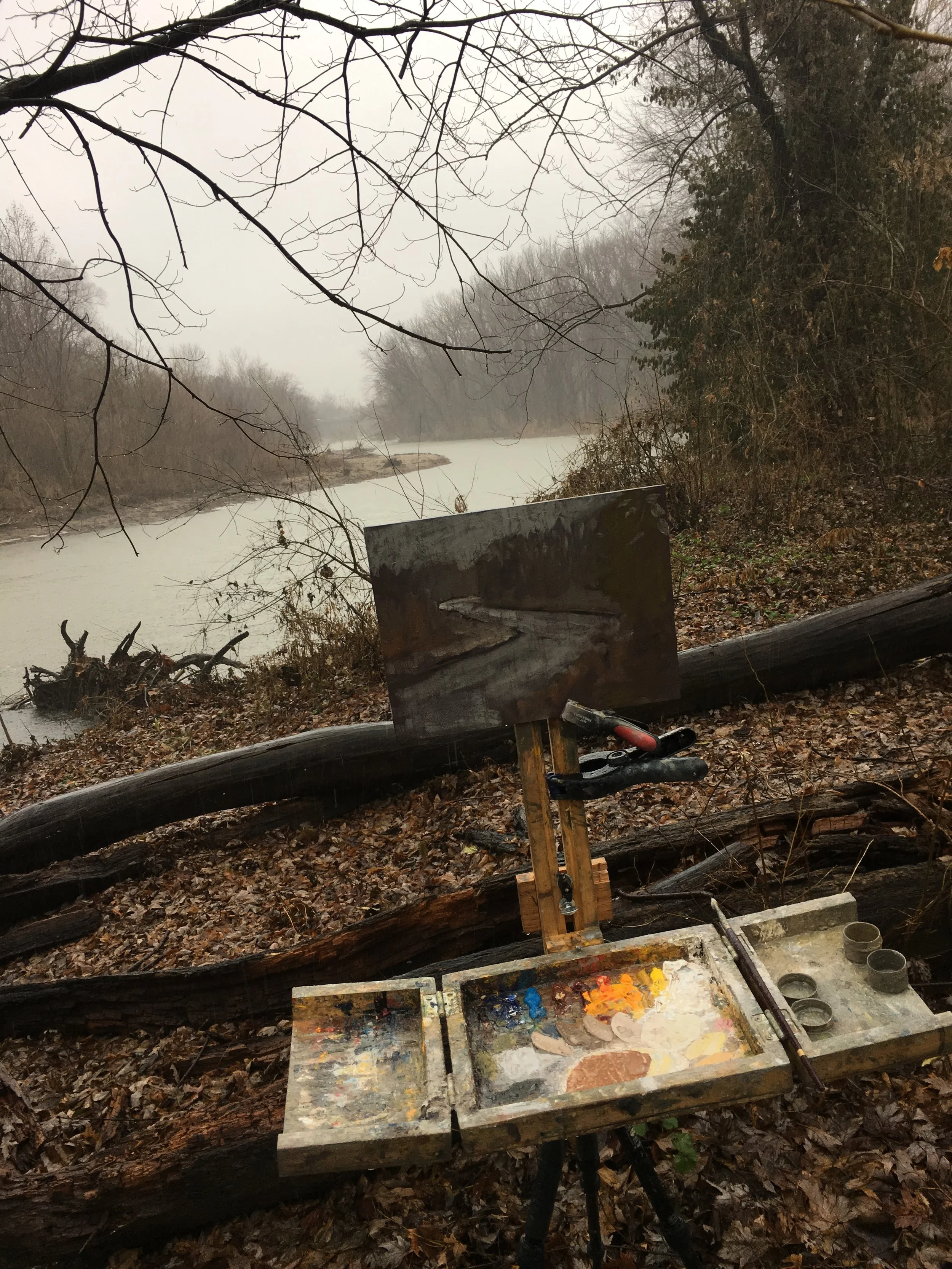 Oil paint will not adhere well to a wet substrate. When it starts raining, I immediately adjust my panel so it is no longer perpendicular to the ground, rather, I lean it in towards me so the rain will hit the back of the panel instead of the front. This does tend to make it more difficult to see actually color and value, but I can at least keep painting.